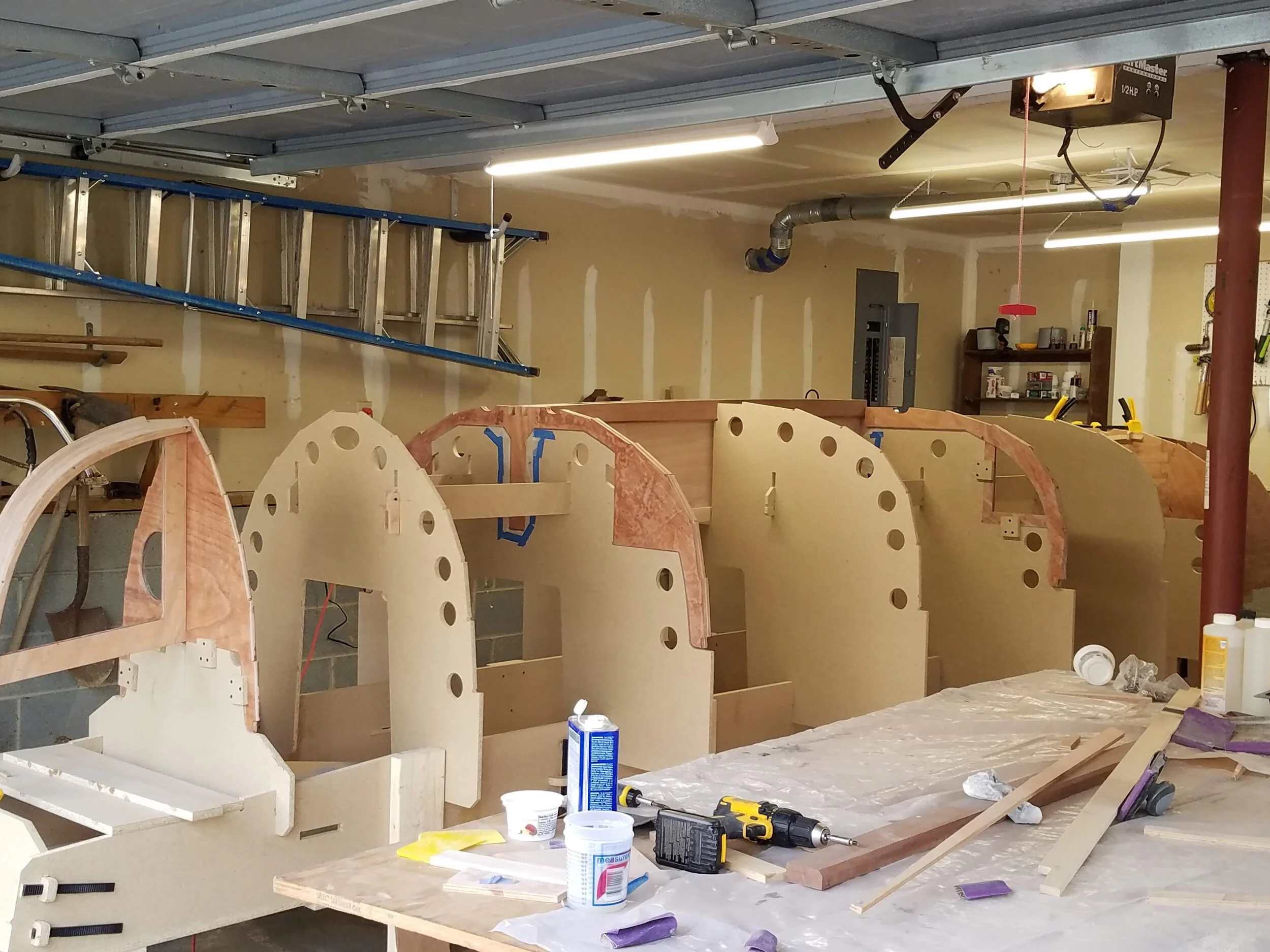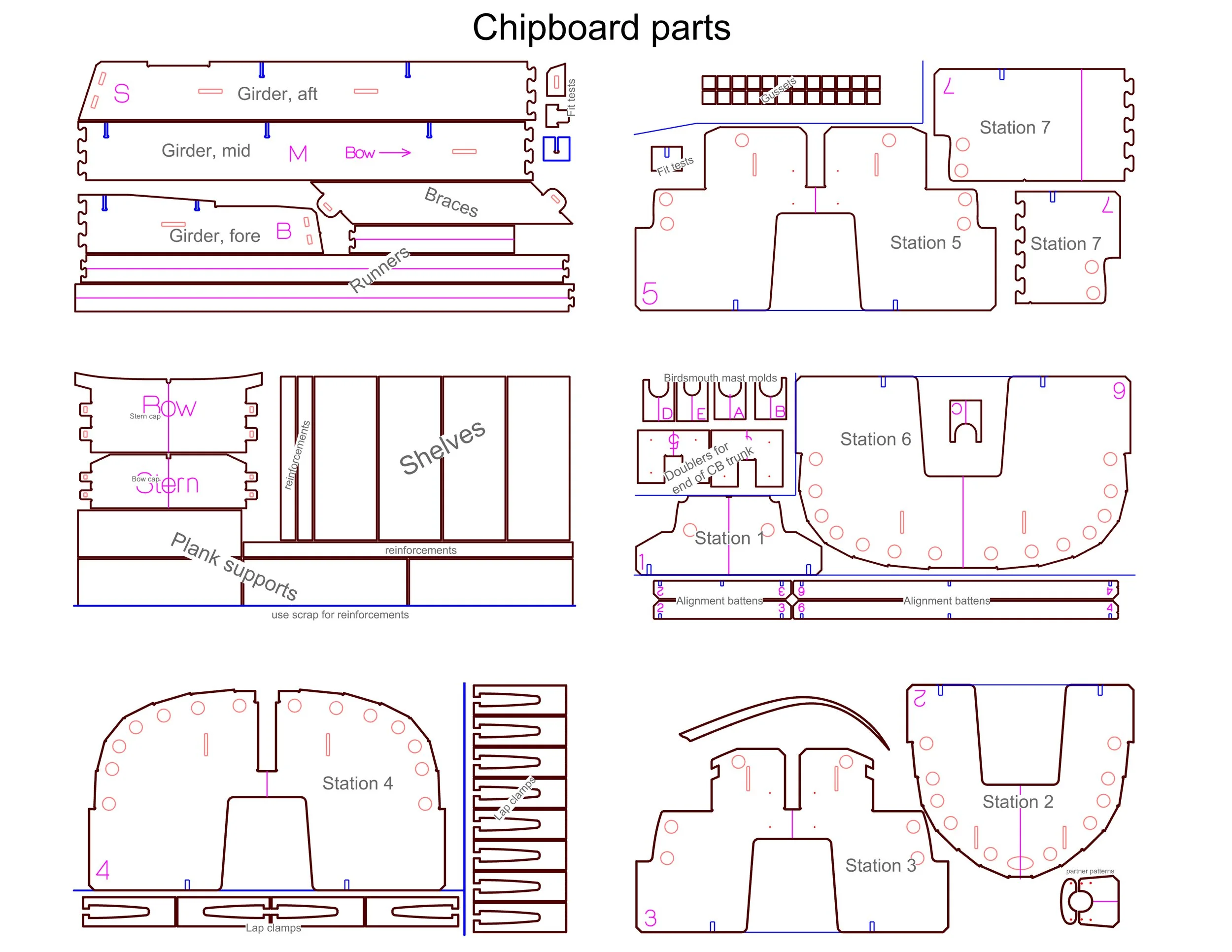The building jig set up of the 18 uses particleboard (orange) for the strongback and molds. Bulkheads, frames, and centerboard mount as part of the set-up, as does the stem and transom. When the boat is flipped, only seating and tank tops need to be installed.